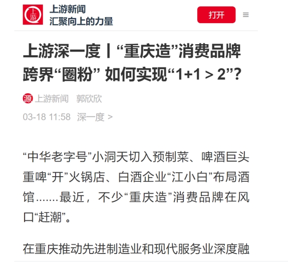 其实,这样的跨界不止发生在啤酒与火锅行业。“中华老字号”小洞天切入预制菜、白酒企业“江小白”布局酒馆、登康口腔联合火锅品牌小龙坎推出爆款“火锅牙膏”、梁平张鸭子推出系列文创包装产品.......不少重庆消费品牌纷纷在风口“赶潮”,实现“1+1>2”的效果。