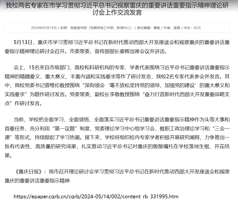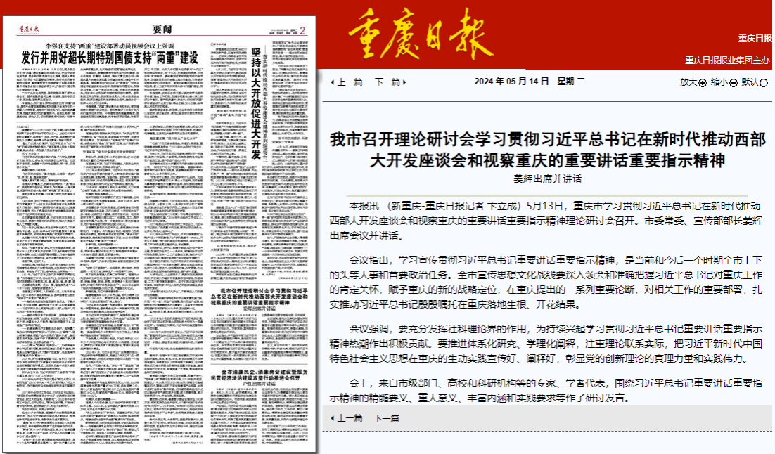 5月13日,重庆市学习贯彻习近平总书记在新时代推动西部大开发座谈会和视察重庆的重要讲话重要指示精神理论研讨会召开。yl7703永利集团副校长、东南亚研究中心主任李敬教授围绕“奋力打造新时代西部大开发重要战略支点”作研讨发言。重庆日报、yl7703永利集团党委宣传部对此进行了报道。